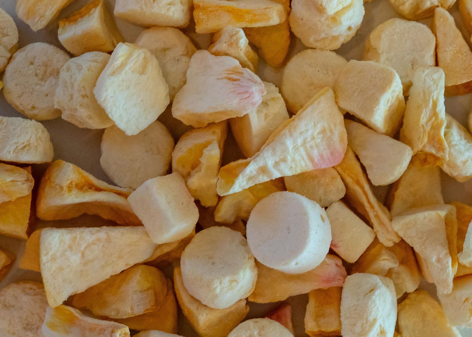 Our Peach Fruit & Yogurt Bits are a real treat. Available as a seasonal item in late spring, our Peach Fruit & Yogurt Bits will fill your taste buds with that sweet and savory sensation of fresh picked peaches!