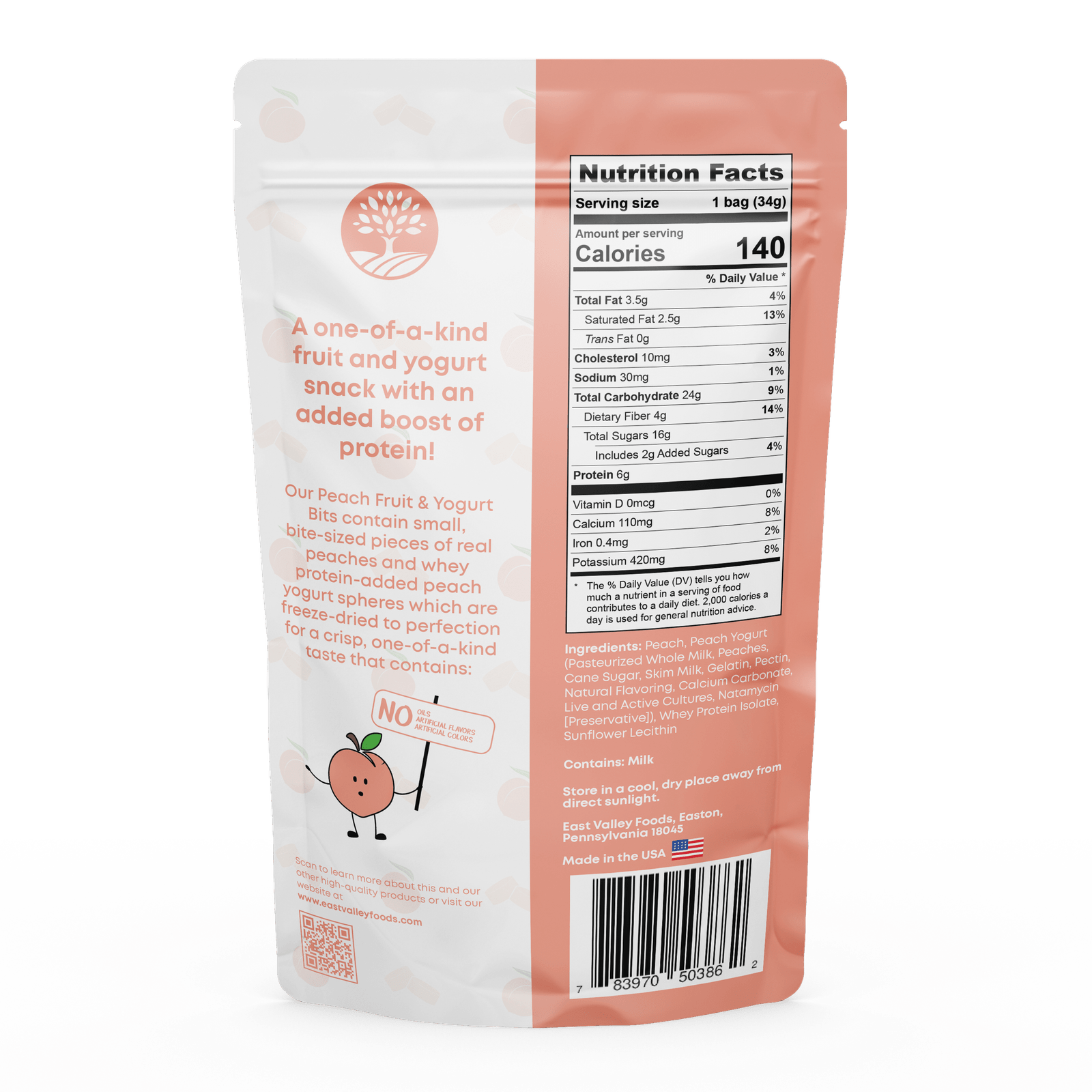 Our Peach Fruit & Yogurt Bits are a one-of-a-kind snack that combines the key vitamins and nutrients of peaches, gut health probiotics of yogurt, and the muscle-building component of whey all in one bag. Freeze-dried to perfection, these bite-sized pieces of real peaches and peach-flavored, whey blended yogurt bits are perfect for breakfast, pre and post workouts, or for those mid-day cravings. With a delectably sweet taste and melt-in-your-mouth texture, Peach Fruit & Yogurt Bits will not only satisfy your hunger, but will help you maintain a healthy lifestyle.