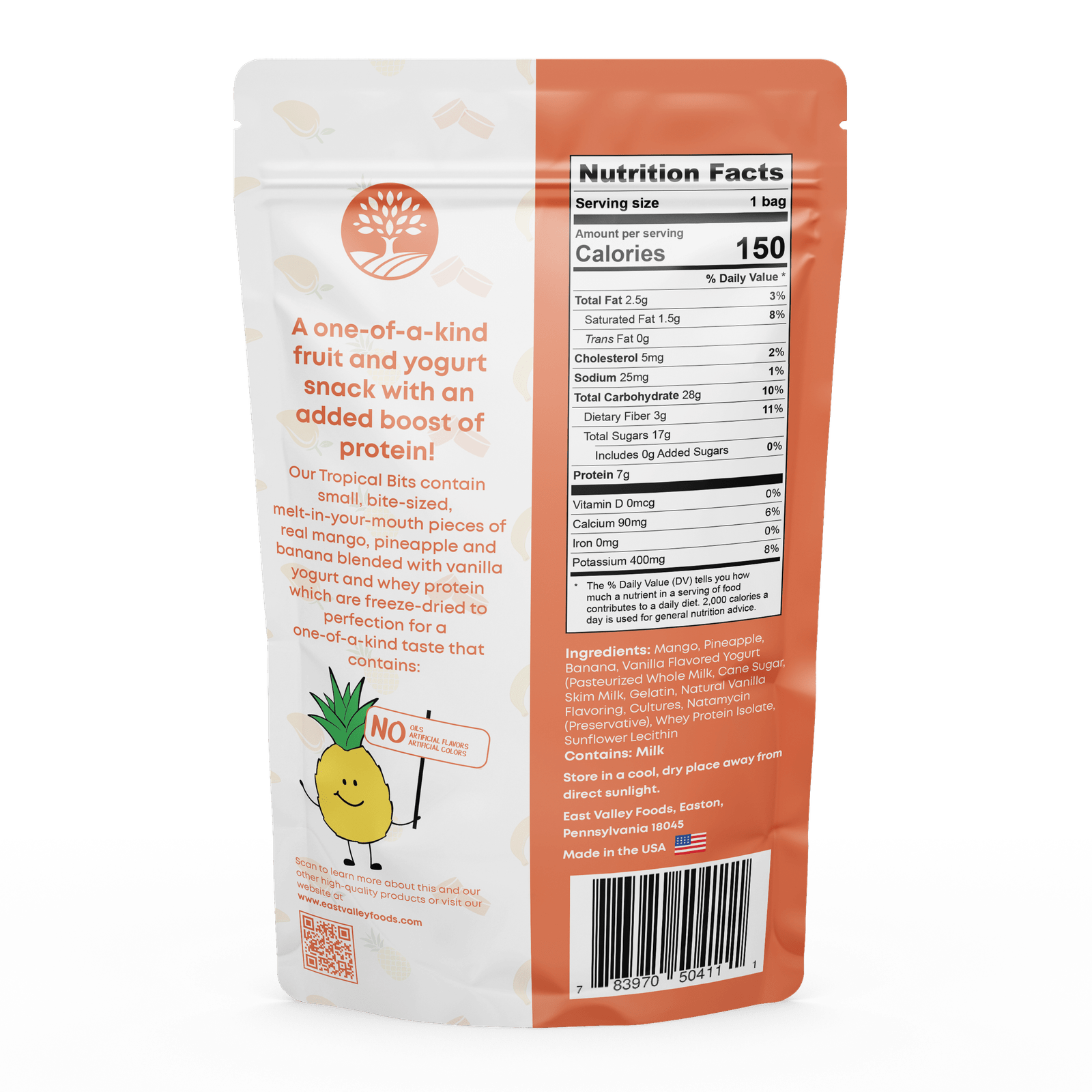Our Tropical Smoothie Bits are a one-of-a-kind snack that combines the key vitamins and nutrients that are present in mangos, pineapple and banana, the gut health probiotics of yogurt, and the muscle-building component of whey all in one bite-sized piece, and without the need for refrigeration. Freeze-dried to perfection, these bite-sized pieces of real mango, pineapple and banana are perfect for breakfast, pre and post workouts, or for those mid-day cravings. With a delectably sweet taste and melt-in-your-mouth texture, our Tropical Smoothie Bits will not only satisfy your hunger, but will help you maintain a healthy lifestyle.